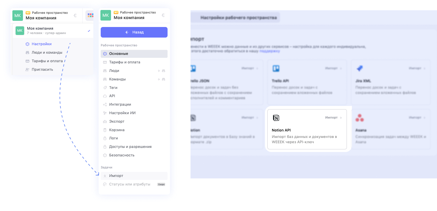 Открой настройки рабочего пространства и кликни на Импорт. Затем выбери «Notion API».