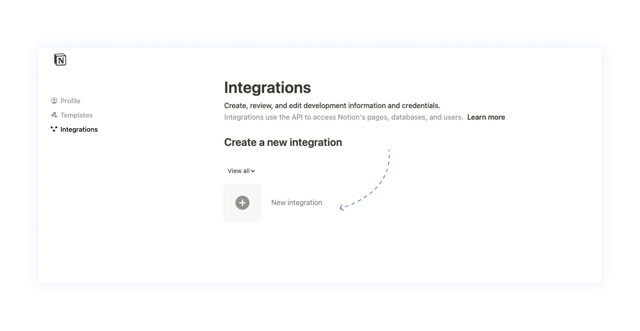 Войди в свой аккаунт Notion. Твой браузер должен помнить данные для авторизации в Notion, поэтому скорее всего достатчоно перейти по ссылке: https://www.notion.so/my-integrations.
