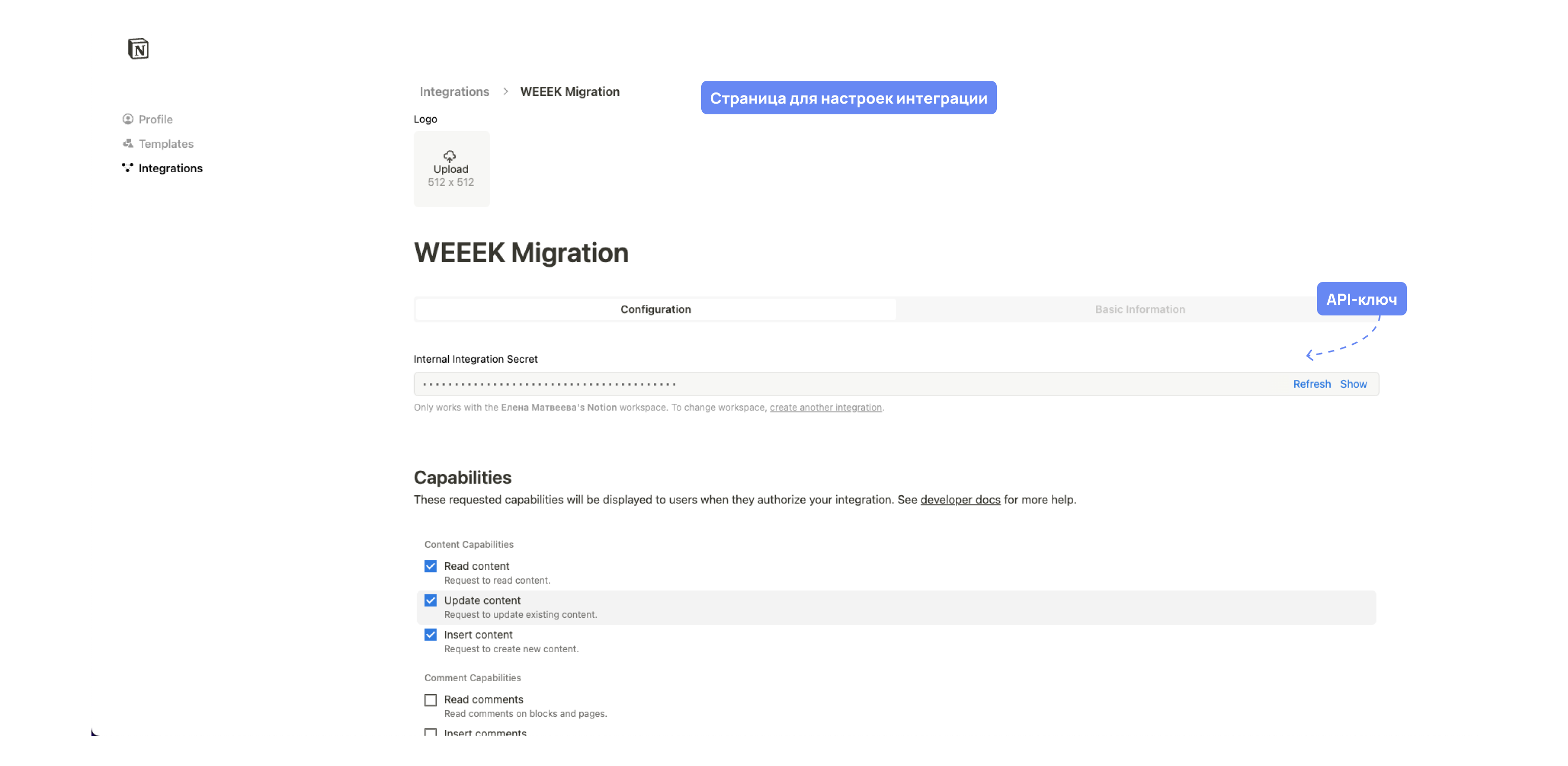 Дальше откроется переход к настройкам конфигурации интеграции. На этой странице можно изменить настройки интеграции и получить API-ключ. Скопируй этот ключ.