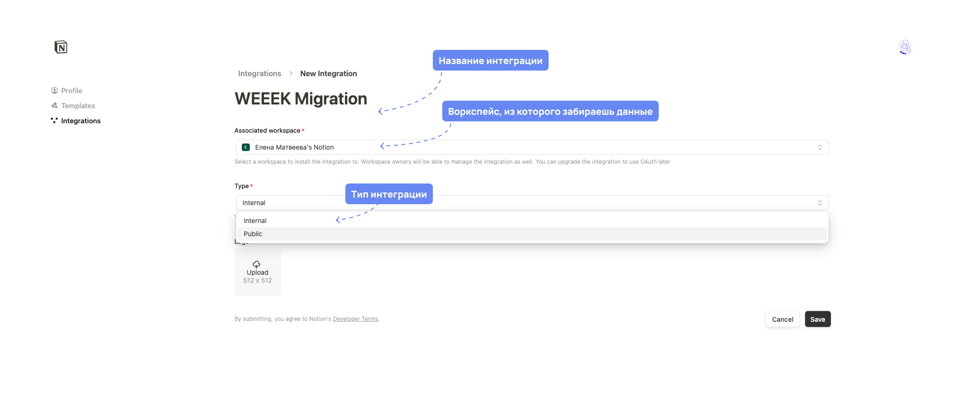 Заполни информацию по интеграции. Нужно добавить название интеграции, выбрать нужный воркспейс и тип интеграции. Выбирай Internal, внутренний. Можно присвоить лого. Когда закончишь, жми Save.