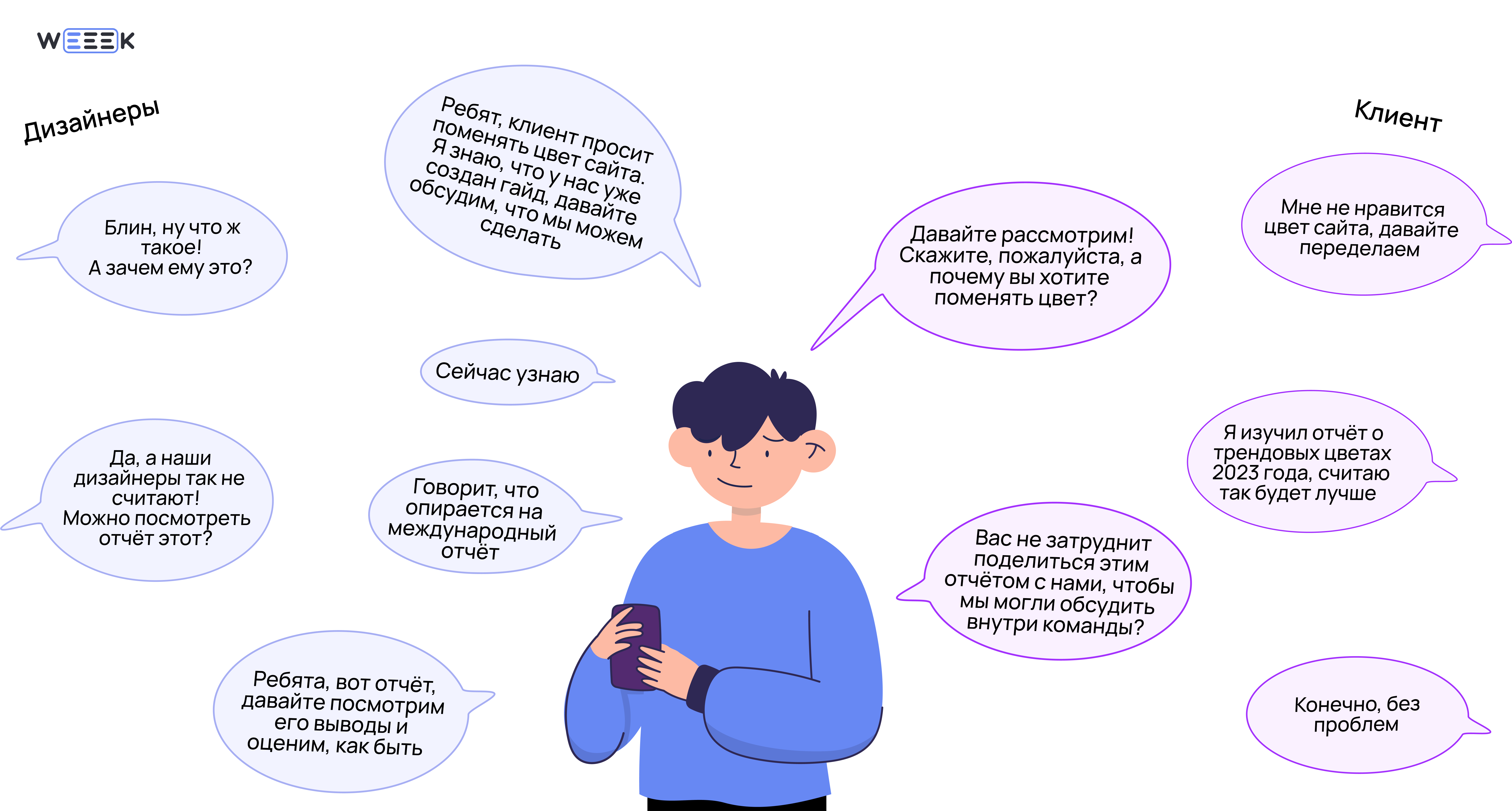 Ещё он фильтр информации и медиатор между клиентом и командой, то есть между требованиями заказчика, его хотелками, претензиями, правками — и между теми, кто будет реализовывать запросы клиента и делать всю работу.