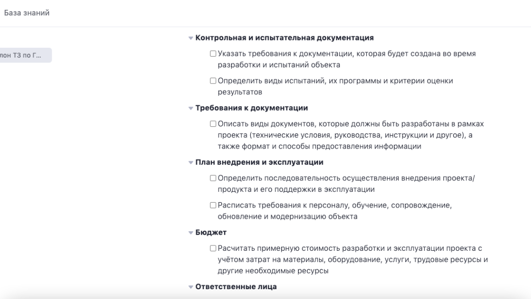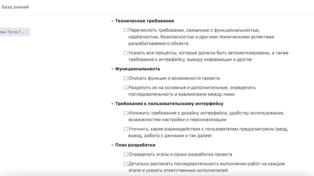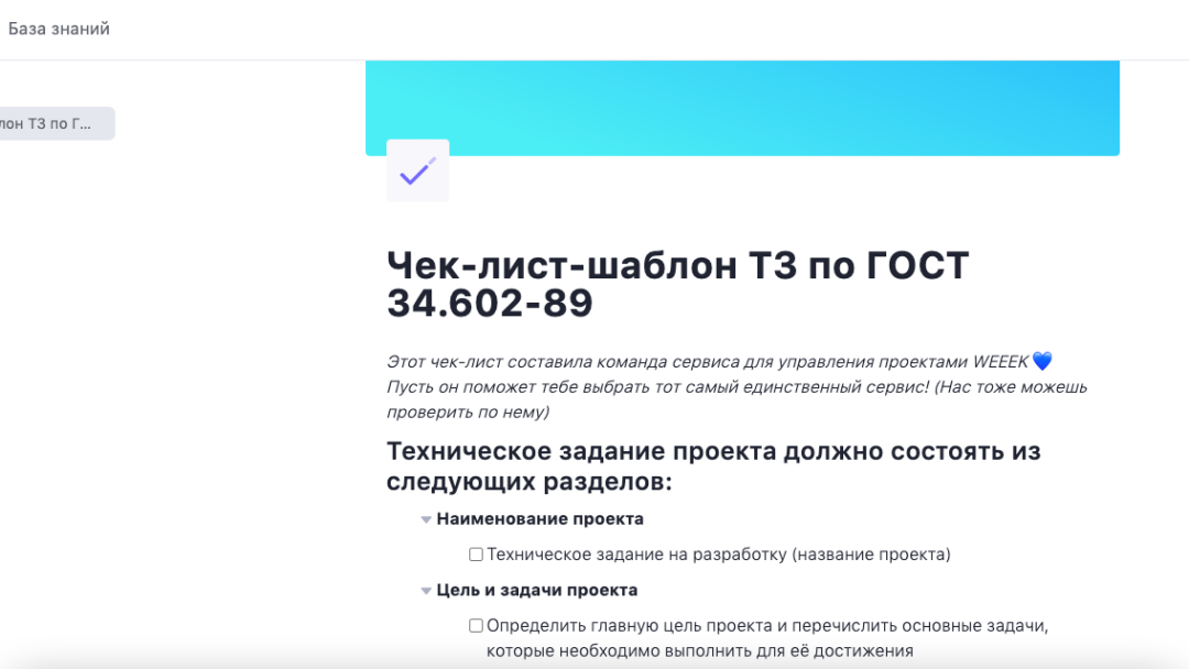 Если вы с командой используете таск-менеджер, то такое ТЗ можно добавить в описание задачи — либо прописать требования в документе и прикрепить его к задаче. В WEEEK можно составить ТЗ в документе Базе знаний и упомянуть его в задаче через @.