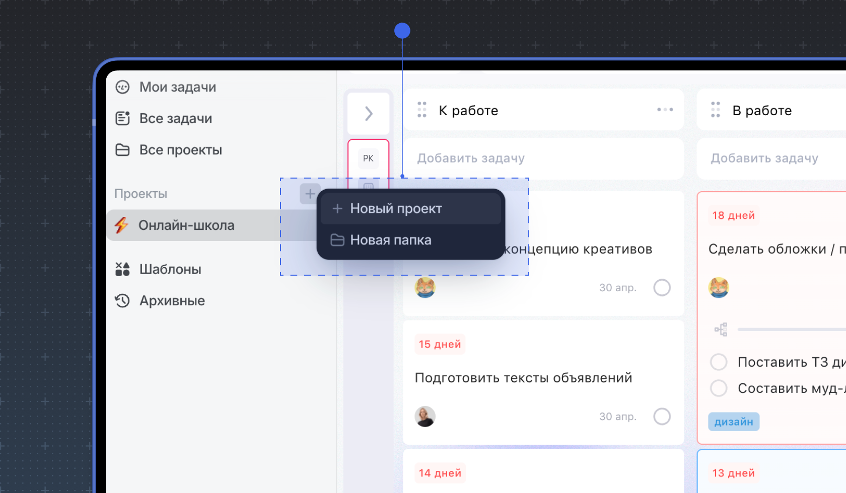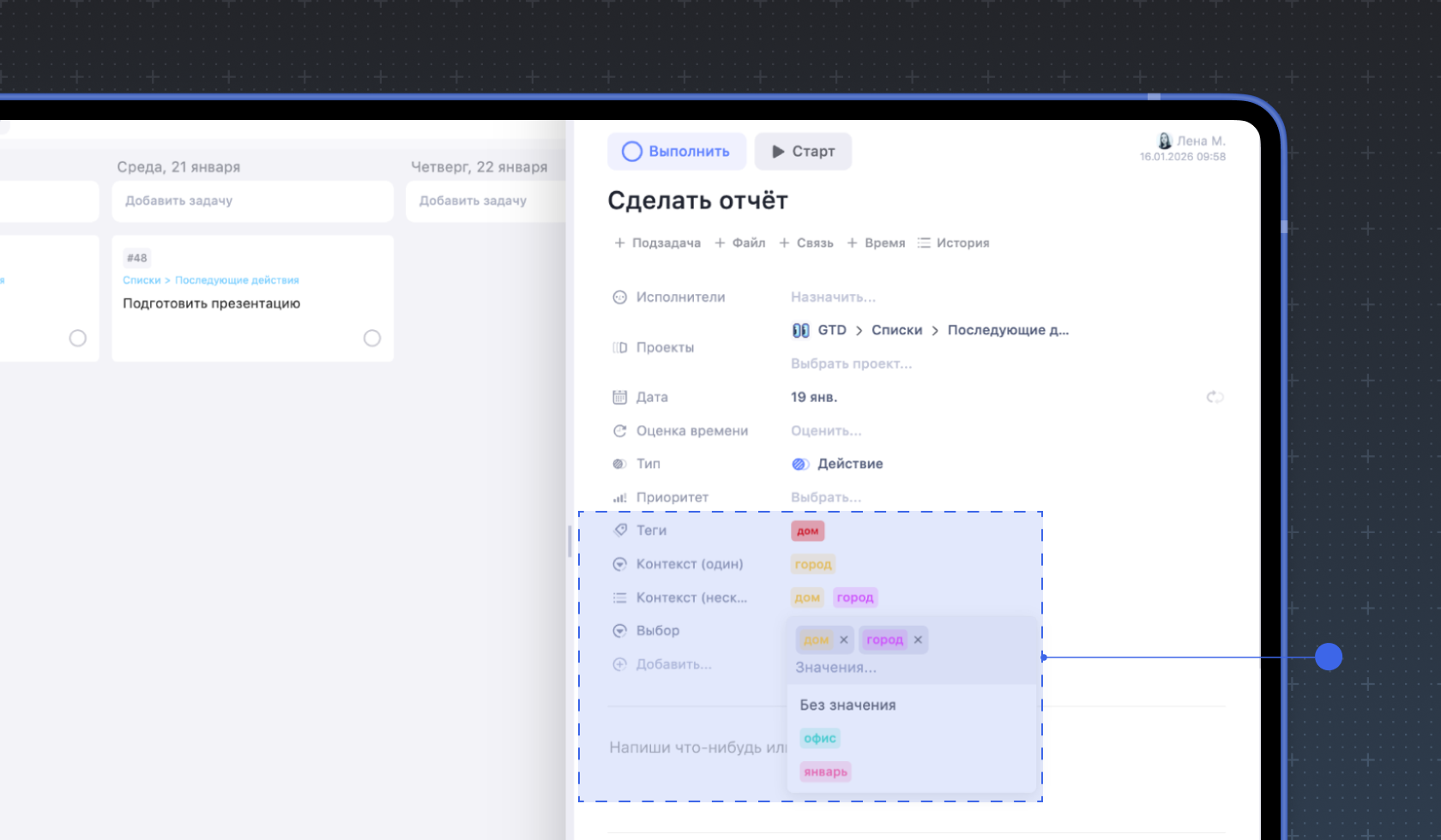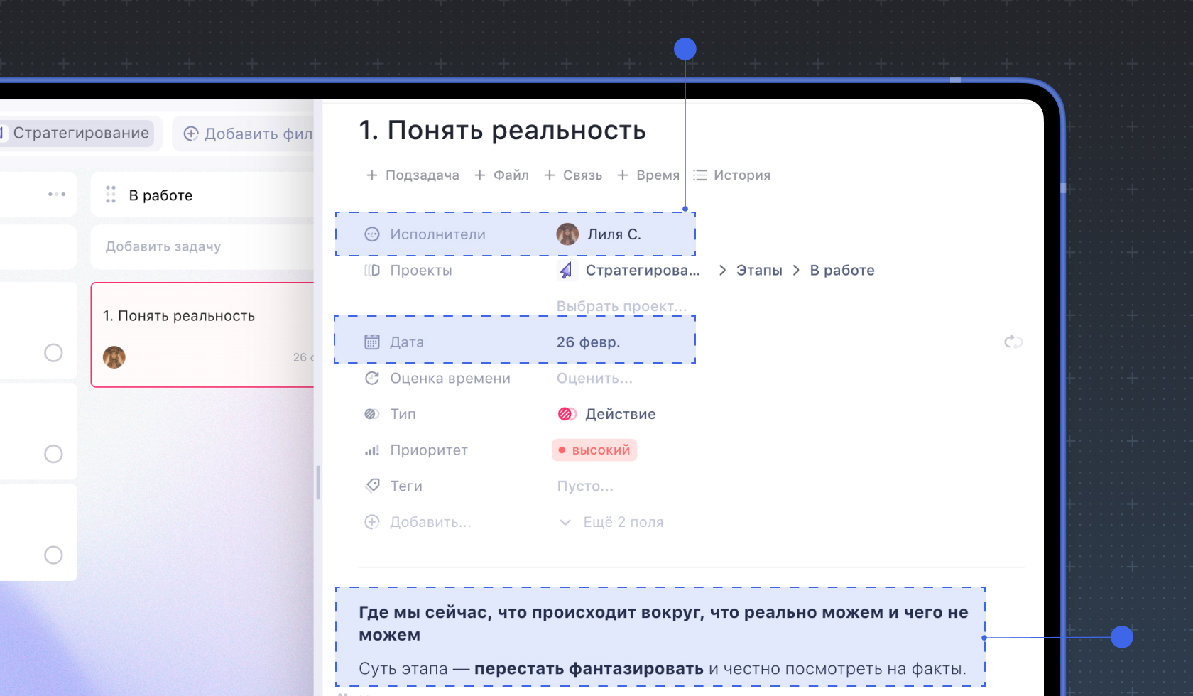 Если у задачи нет конкретного исполнителя и дедлайна, она, скорее всего, не будет сделана вовремя. В Weeek можно закрепить задачу за конкретным человеком и поставить дедлайн — это сразу снизит риск зависших задач.