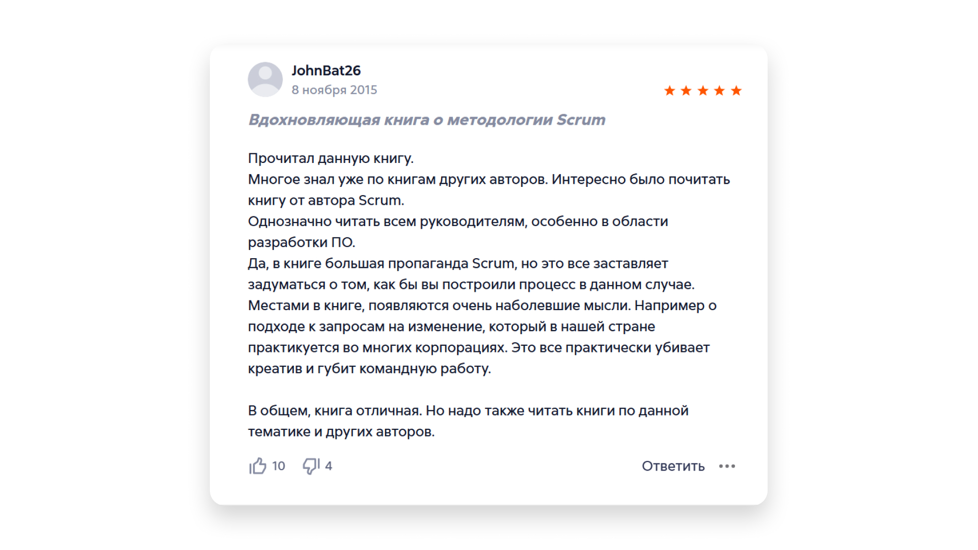 Это один из бестселлеров по Scrum. Автор рассказывает, как появилась эта методология, в чём её суть, зачем нужны роли и как проходят ключевые события — спринты, планирования, ретроспективы. Ещё есть примеры, как Scrum ускоряет проекты в 5–10 раз, избавляет от бюрократии и помогает фокусироваться на ценности для клиента.