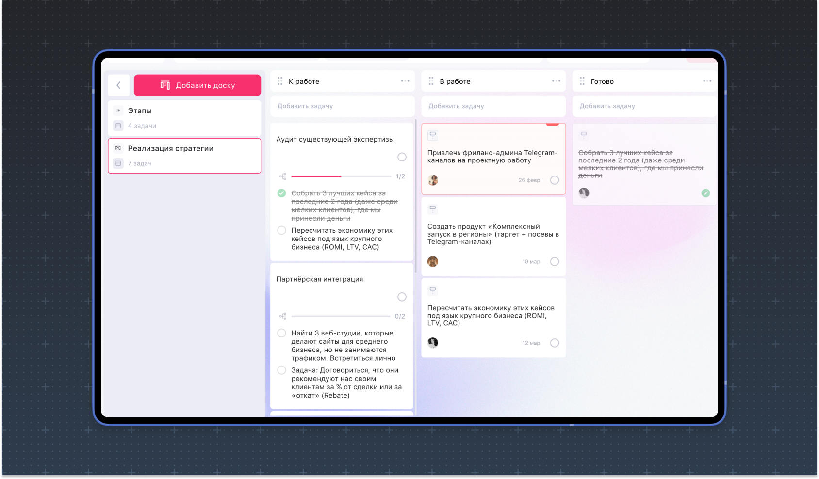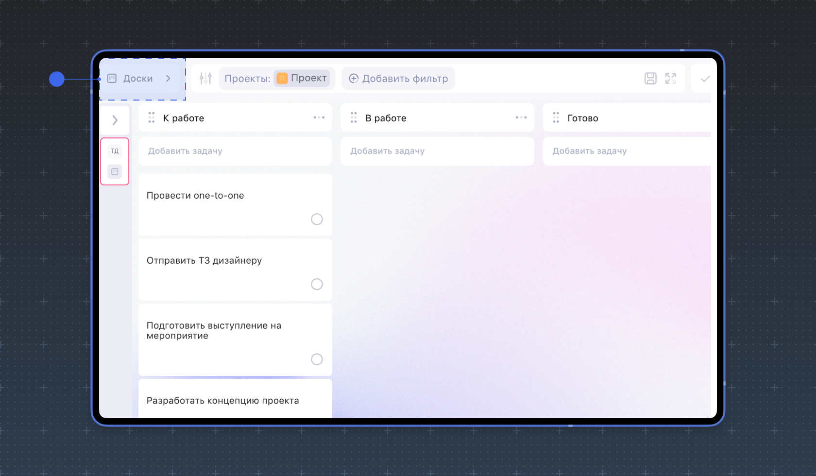 Перейди в режим Доска и в первую же колонку внеси все задачи — даже сырые и неструктурированные. На этом этапе важна полнота, на порядке пока не фокусируемся.