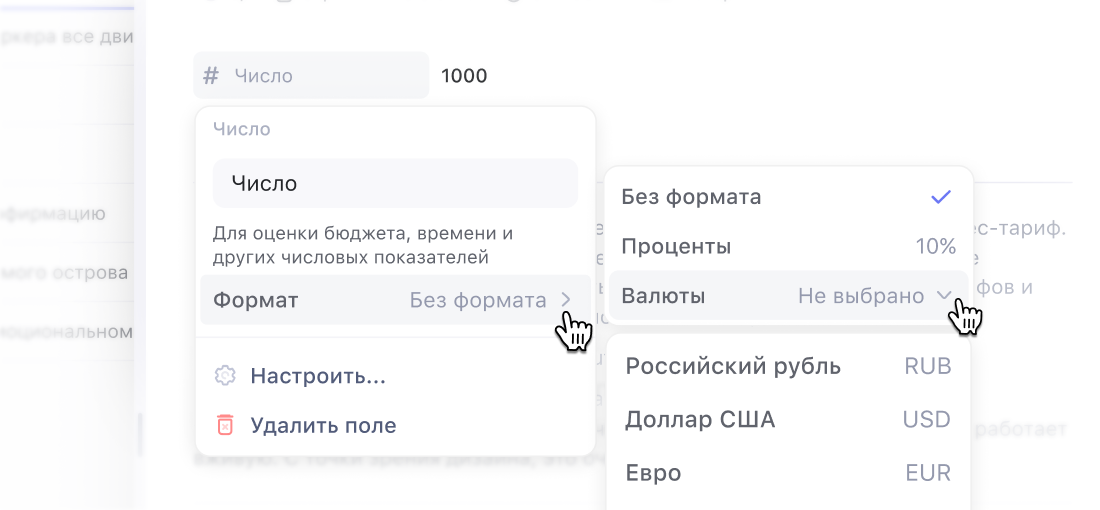 - Валюта — можно выбрать любую мировую валюту. Удобно, если нужно зафиксировать стоимость сделки, гонорар исполнителя или бюджет проекта