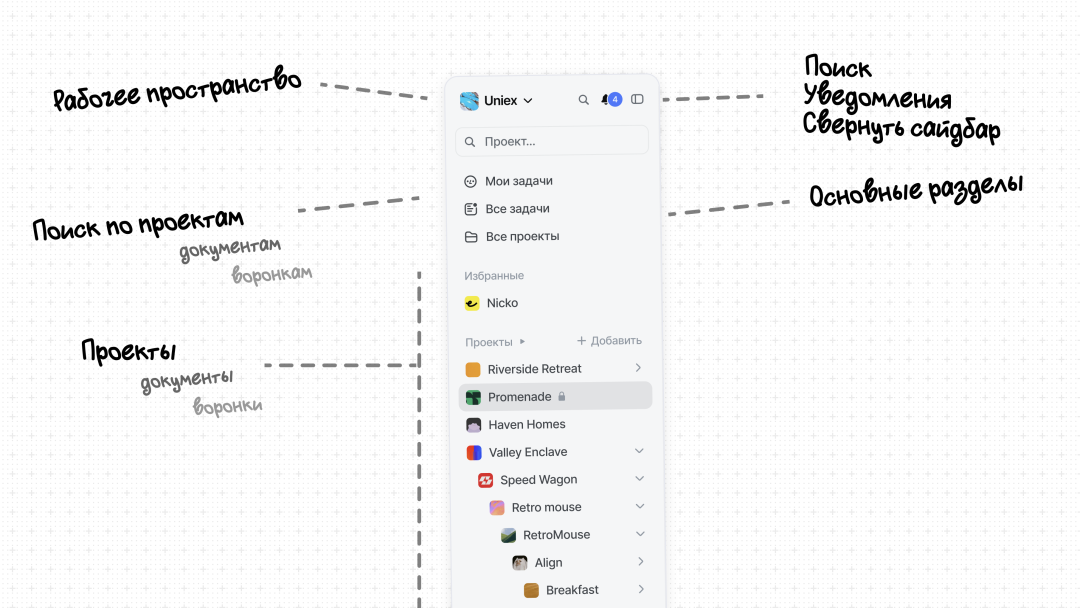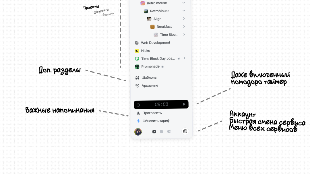 - Теперь между Задачами, Базой знаний и CRM можно переключаться в один клик — в левом нижнем углу экрана
