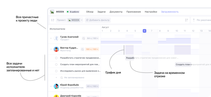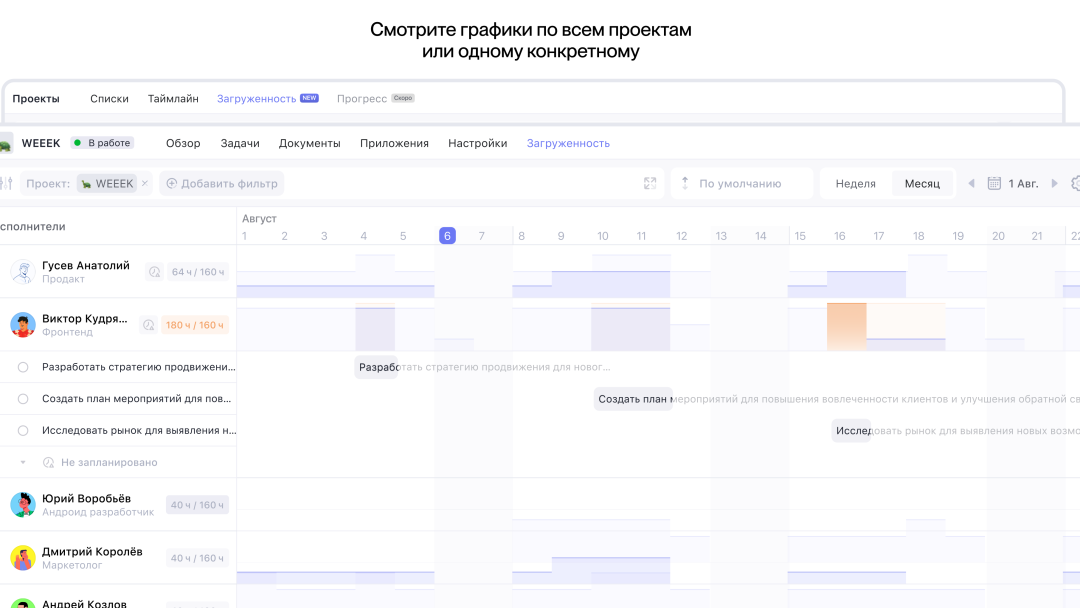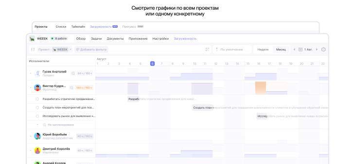 Внешне Загруженность напоминает диаграмму Ганта: слева — список исполнителей, справа — их рабочая нагрузка по дням. Чтобы попасть в раздел, откройте проект или вкладку Все проекты. Управлять загруженностью можно в разрезе недели или месяца.