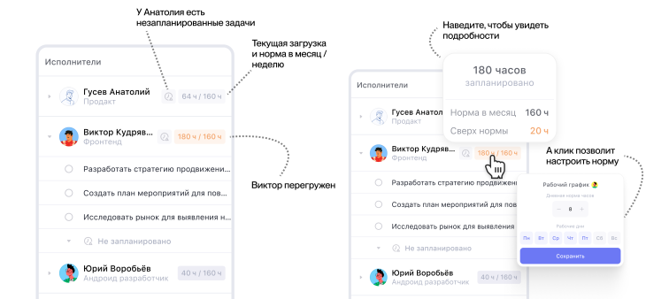 Загруженность считается относительно режима работы участника — его рабочих дней и нормы часов. Если нагрузка превышает дневную норму, такие дни подсвечиваются оранжевым.