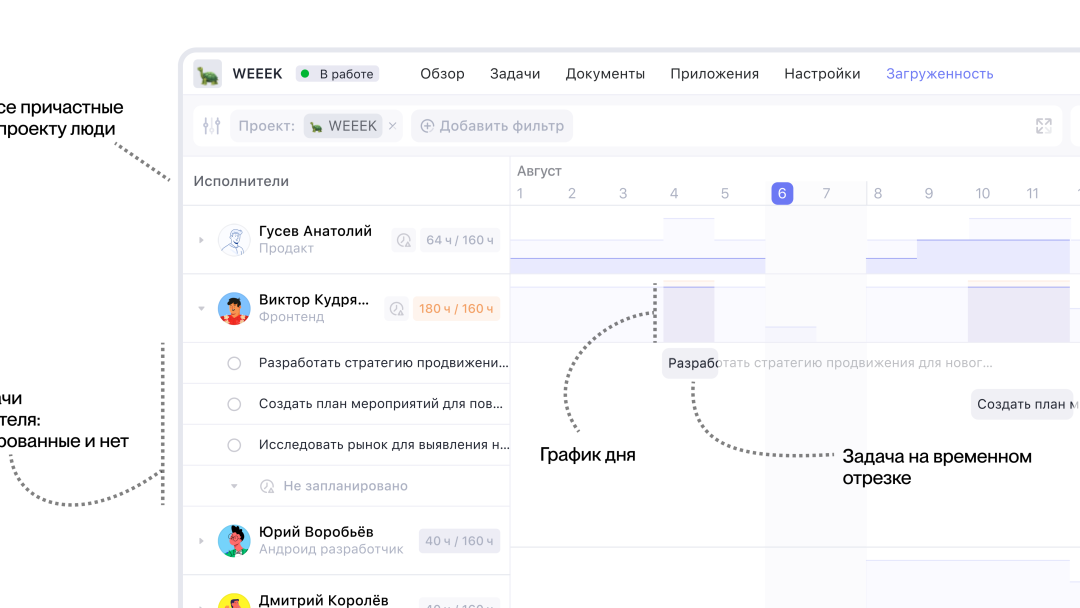 В проектах появился новый раздел — Загруженность. Он помогает контролировать рабочую нагрузку участников: сколько часов у каждого запланировано и укладываются ли они в рабочий график.