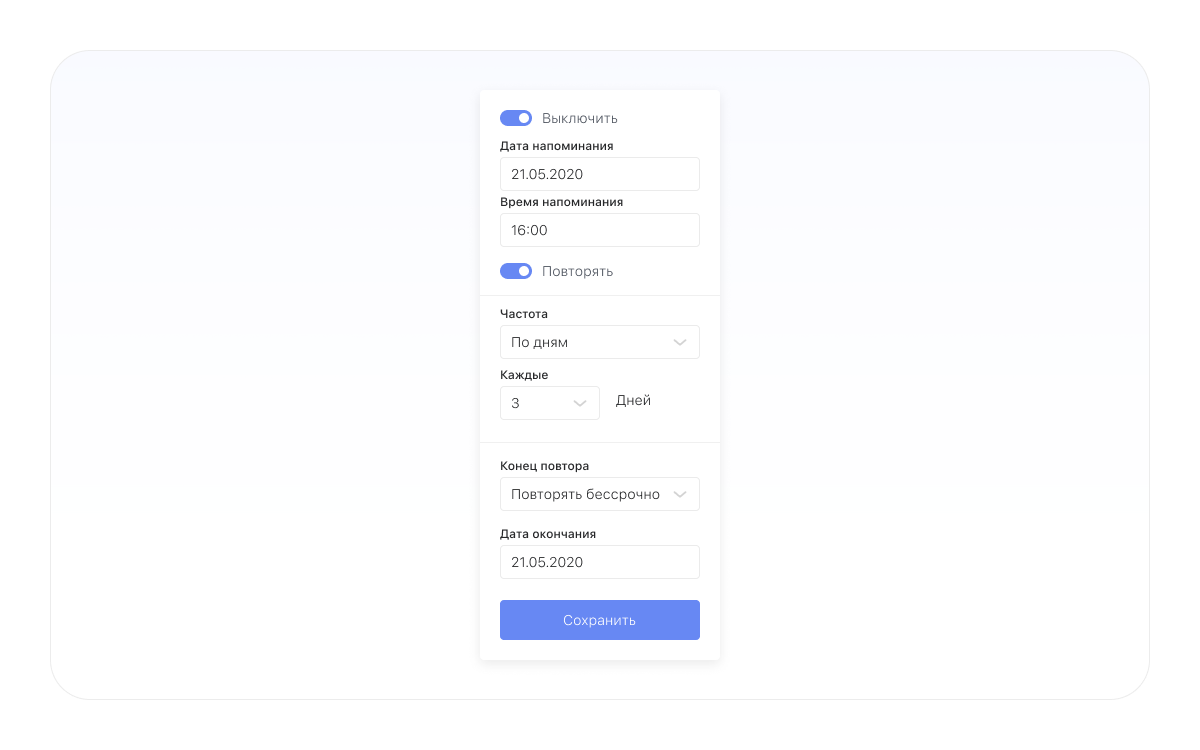 - включить повторяющиеся уведомления, например, если дедлайн задачи не скоро и есть высокий шанс про неё забыть.