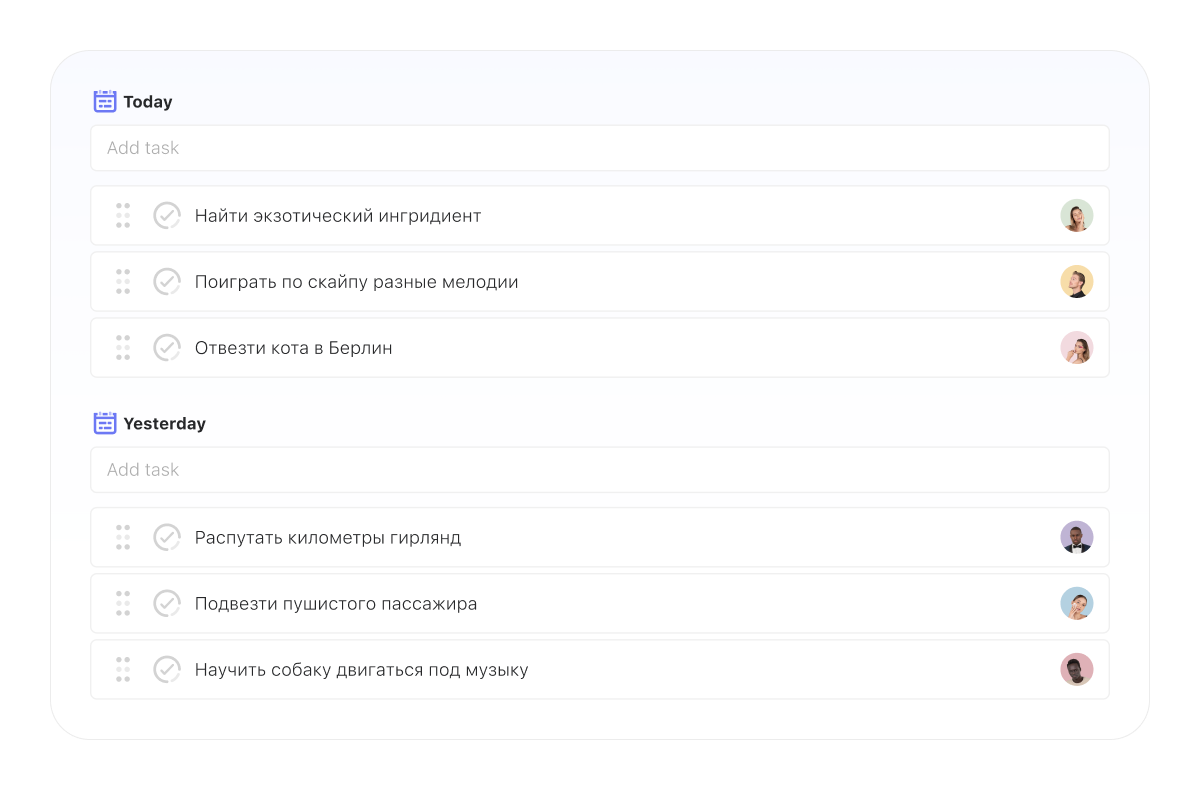 В каждой группе можно создать задачу так же, как в режиме календаря и режиме досок — просто поставить курсор в поле «Добавить задачу», написать название и нажать Enter.