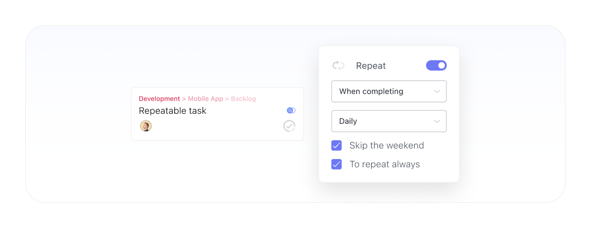 Чтобы сделать задачу повторяющейся, нажми на кнопку с датой и включи тумблер «Повторять». После этого появятся гибкие настройки: