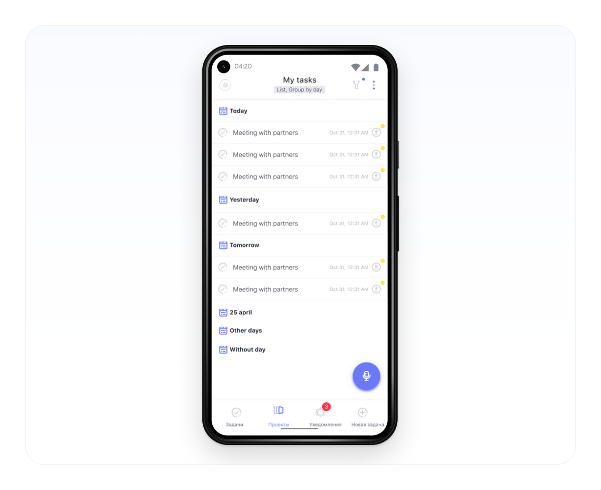 Как и в веб-версии, задачи в этом режиме автоматически разбиваются на группы по дедлайну: