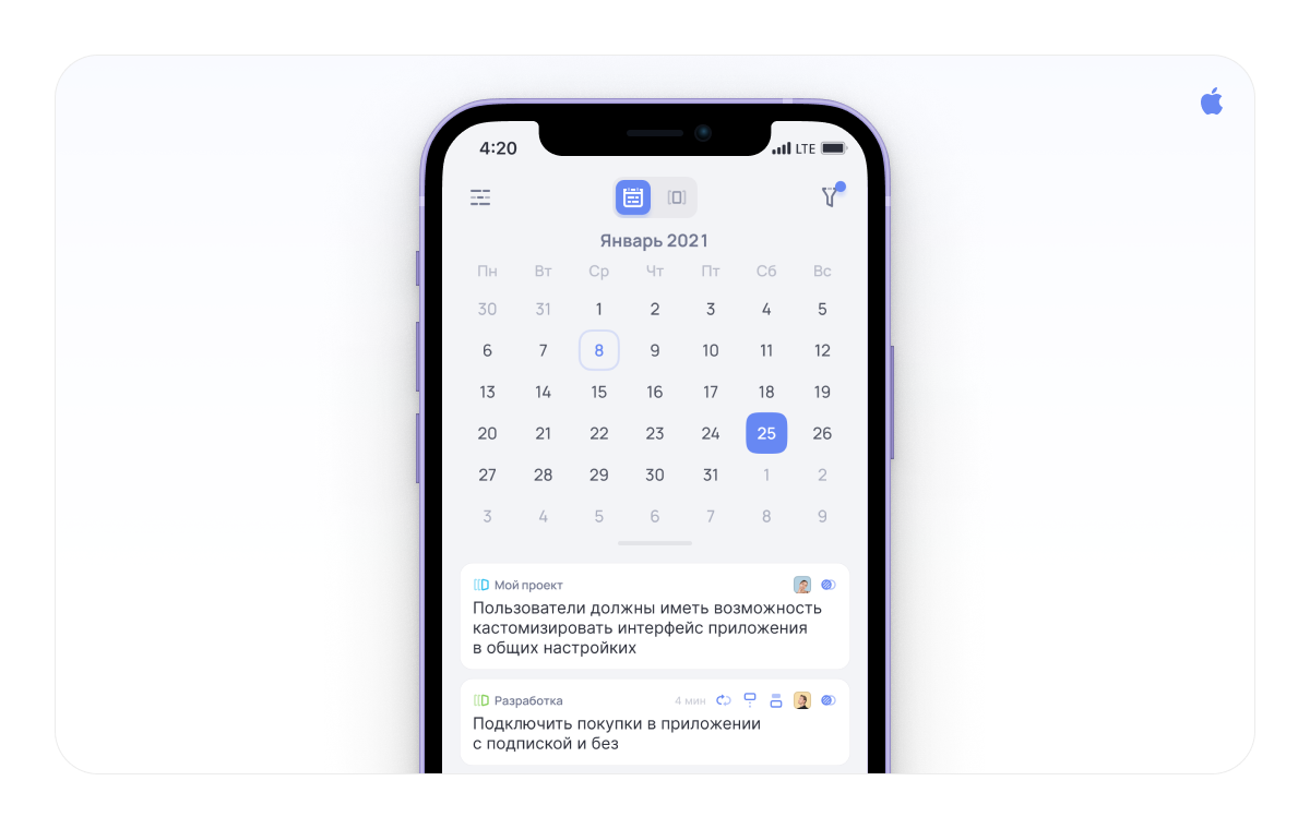 - В режиме календаря (список задач на сегодня) появился человеческий календарь с датами, который можно свайпать по неделям или месяцам. Свайпнешь вниз — перейдёшь в просмотр по месяцам, вверх — в просмотр по неделям.