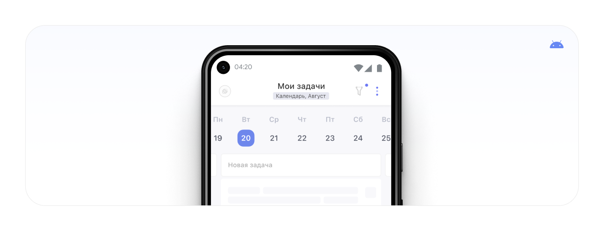 «А что там насчёт Android?» — слышатся вопросы 50% наших мобильных пользователей. А у вас, дорогие друзья, появился удобный недельный календарь. Он отображается прямо над списком задач на день, и с его помощью очень легко переключаться между днями и неделями: тапнул по дате — выбрал день, свайпнул вправо-влево — переключил неделю.