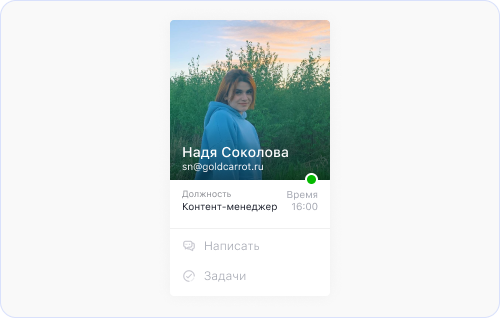 - Поменяли карточку пользователя. Теперь, если навести курсор на иконку исполнителя задачи — можно посмотреть, когда он был в сети, должность, его задачи или написать ему в чат.