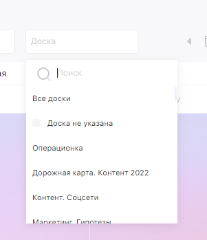 - Фильтр по доскам. Заходи в проект и в фильтре выбирай нужную доску — проще ориентироваться в куче досок.