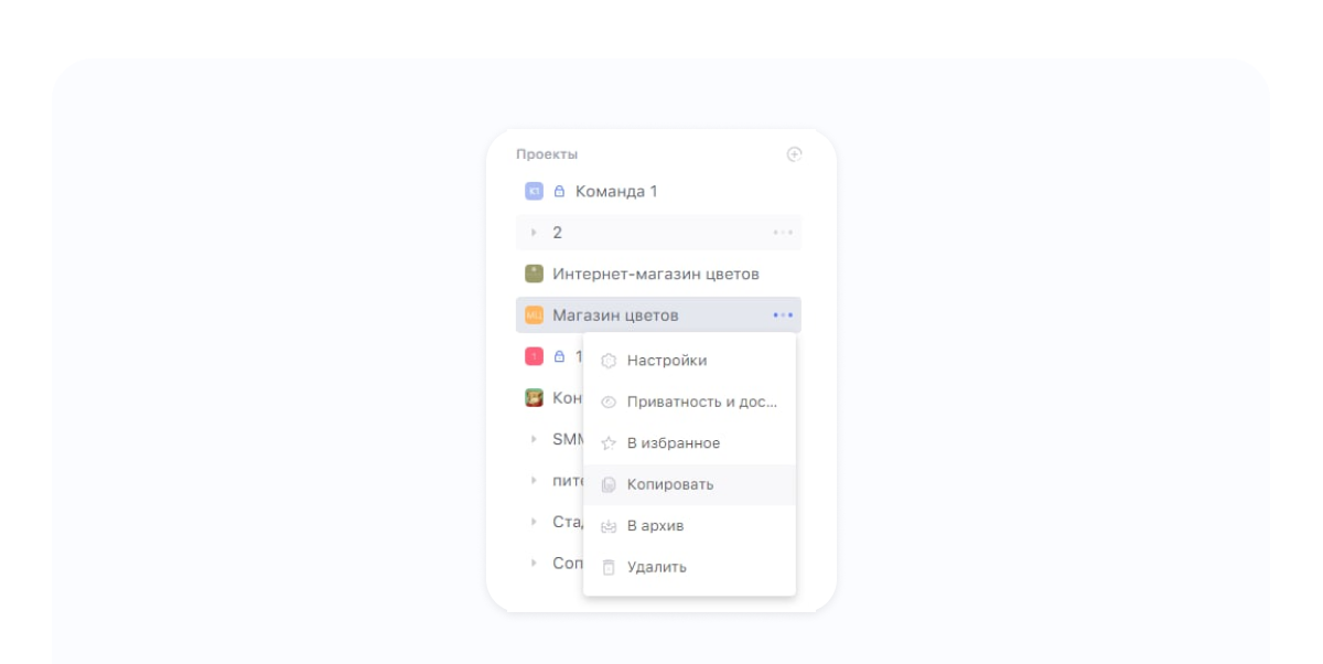 - Копирование проектов. Если у тебя есть проекты с идентичными процессами, не нужно вручную дублировать задачи из одного в другой. Также наведи курсор на три точки у проекта и выбери «Копировать». Полная копия проекта появится следующей строкой.