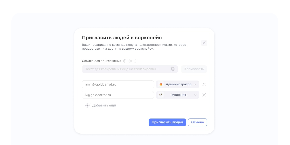 - Переделали окно приглашения в воркспейс. Оно стало красивее и полезнее — в нём можно сразу выбрать роль нового сотрудника.