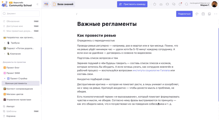 - Документы по проектам. Создавая проект в таск-менеджере, он автоматически дублируется как документ в Базе знаний. Ты можешь писать в нём, а также сделать его папкой и добавлять ещё документы по проекту.