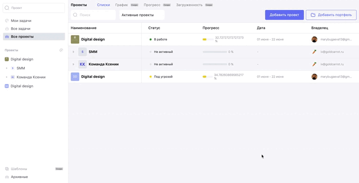 - 3. Прогресс — в процентах и в шкале. Если сотрудники не успевают закончить проекты в портфеле к дедлайну, ты сможешь быстро это отследить и оптимизировать процесс.