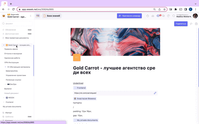 Как поделиться папкой: создай документ в Базе знаний и нажми справа три точки — и в выпадающем меню нажми «Создать». Автоматически появится вложенный документ, а первый — станет папкой или главным документом.