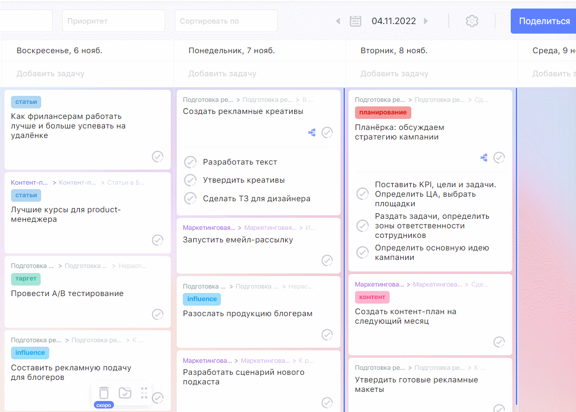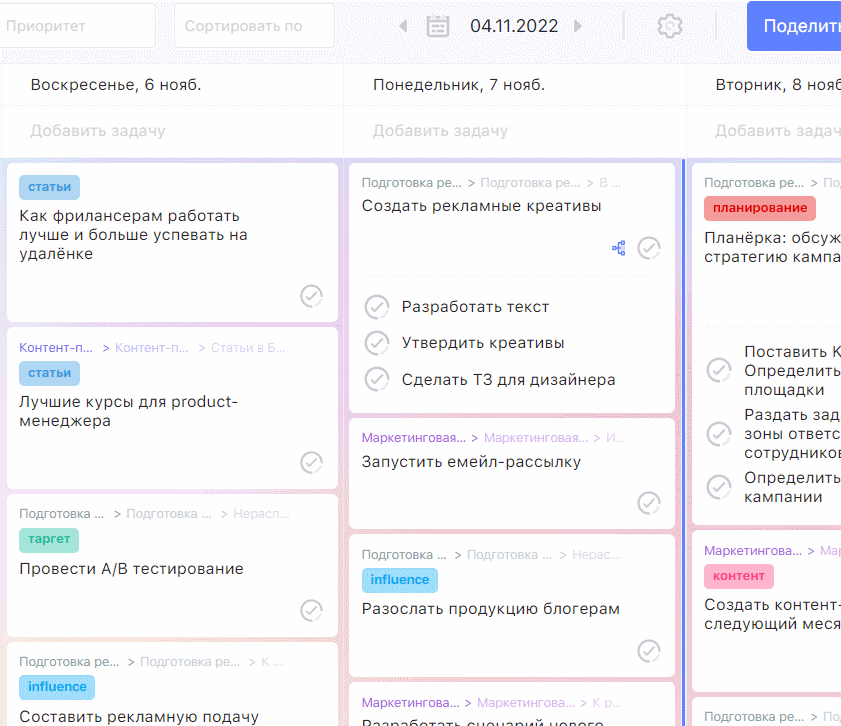 - Копирование. Когда заканчиваешь задачу, появляется её полная копия в выбранный день.