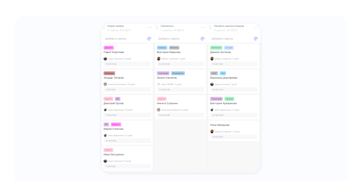 Отображение суммы сделки. Теперь не нужно открывать карточку клиента, чтобы посмотреть сумму продажи — она отображается сразу на карточке. Увидеть это можно в левом нижнем углу.