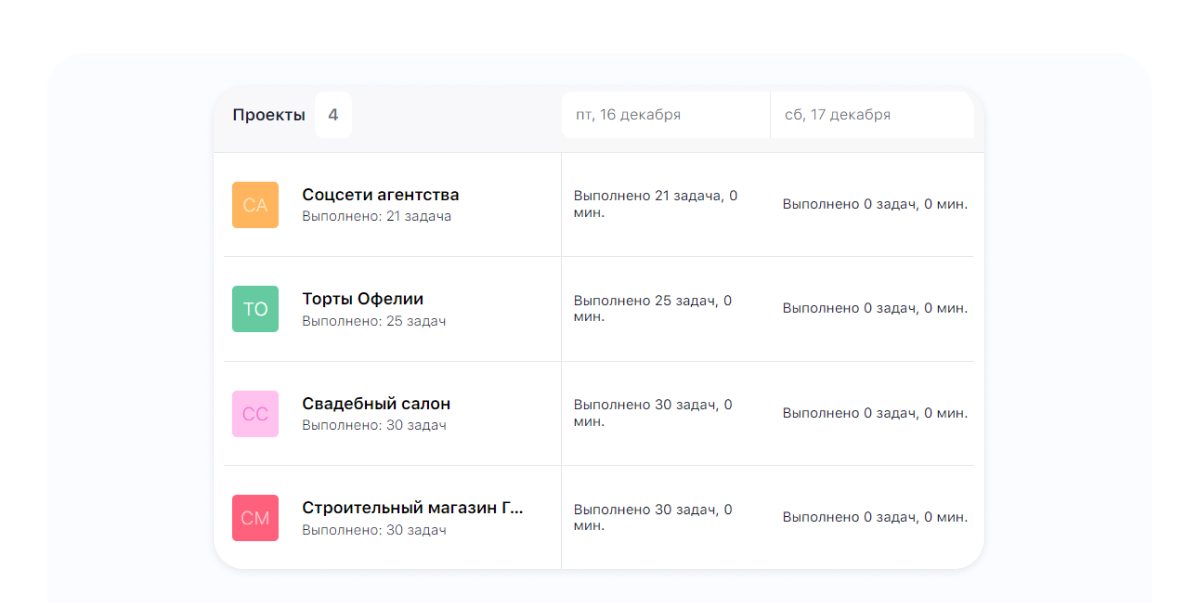 Аналитика по проектам. В разделе Аналитика появились отчёты по проектам — можно проанализировать, сколько задач было сделано по каждому проекту в разрезе каждого дня.