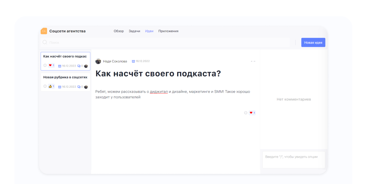 Обновлённые Идеи. Раздел немного видоизменился, появился текстовый редактор, а вместо голосования лайками — эмодзи.