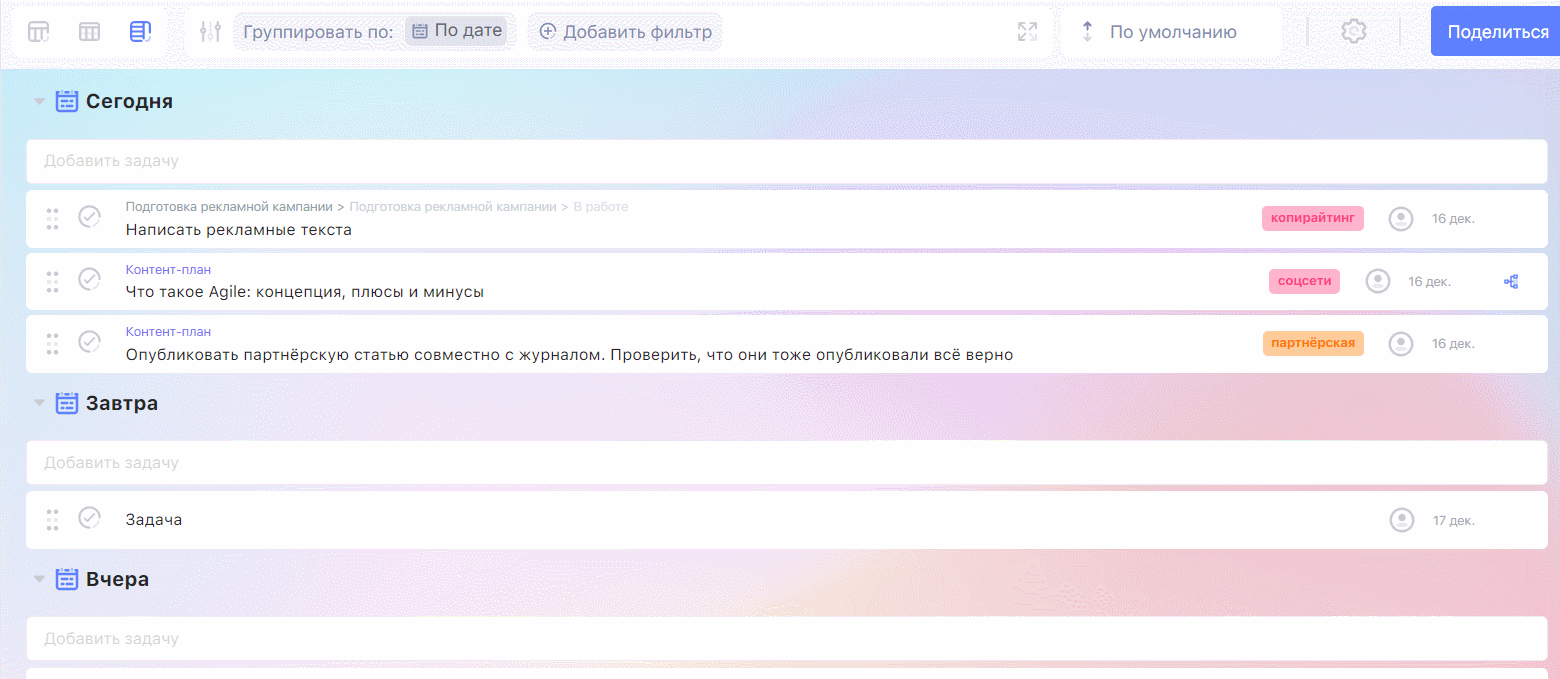 Улучшенные фильтры в списках. Если зайти в списки, появятся новые фильтры — просроченность и группировка: