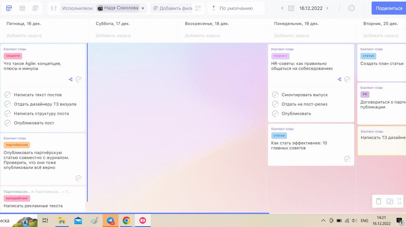 - Группировка по колонкам. Если выбрать такой фильтр, задачи списком распределятся по колонкам — сначала список задач по одной колонке в доске, потом по следующей и так далее.