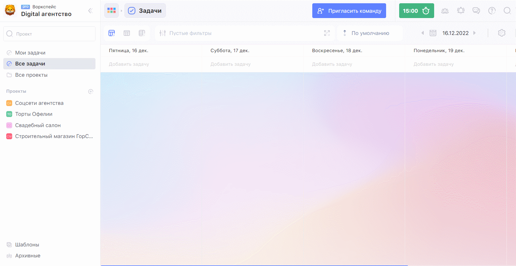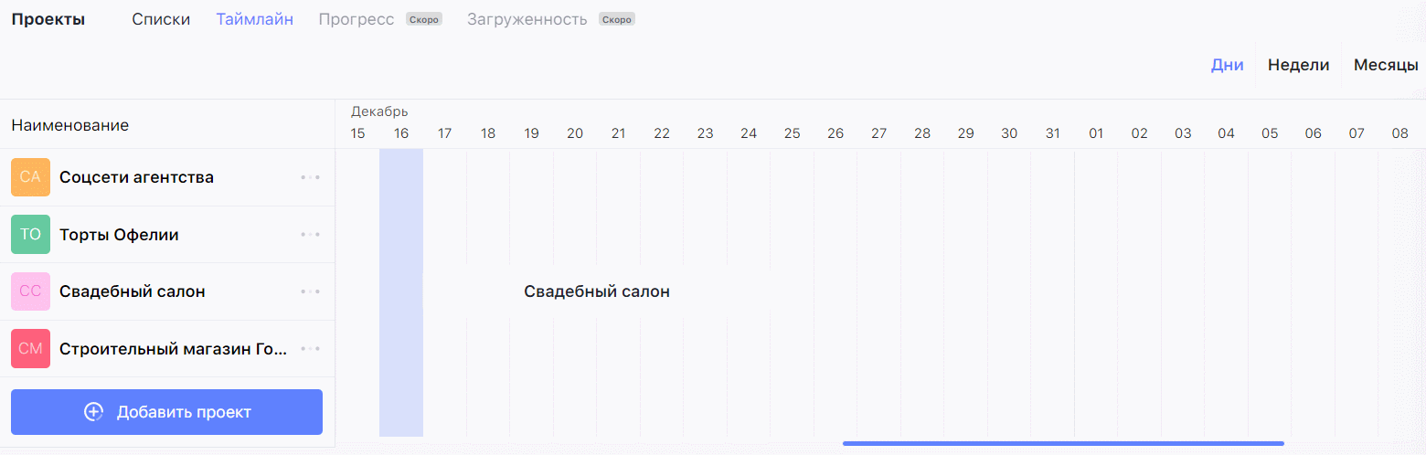 Чтобы зайти в диаграмму, заходи в Задачи и в меню выбирай «Все проекты», а затем «Таймлайн». Там выбери удобный вид диаграммы — по дням, неделям или месяцам, а затем выбери нужному проекту дату начала работы и окончания.