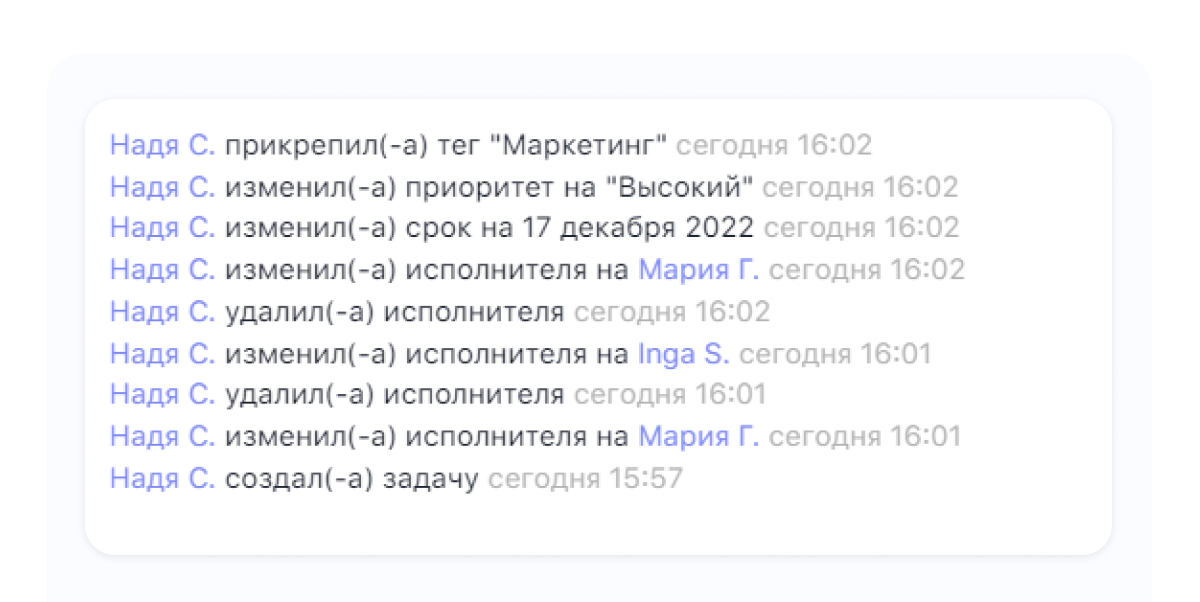 Новые пункты в истории изменения задачи. Теперь в истории изменений можно отследить добавление или удаление тегов, подзадач, подписчика, блокировки, а ещё дублирование задач и многое другое.