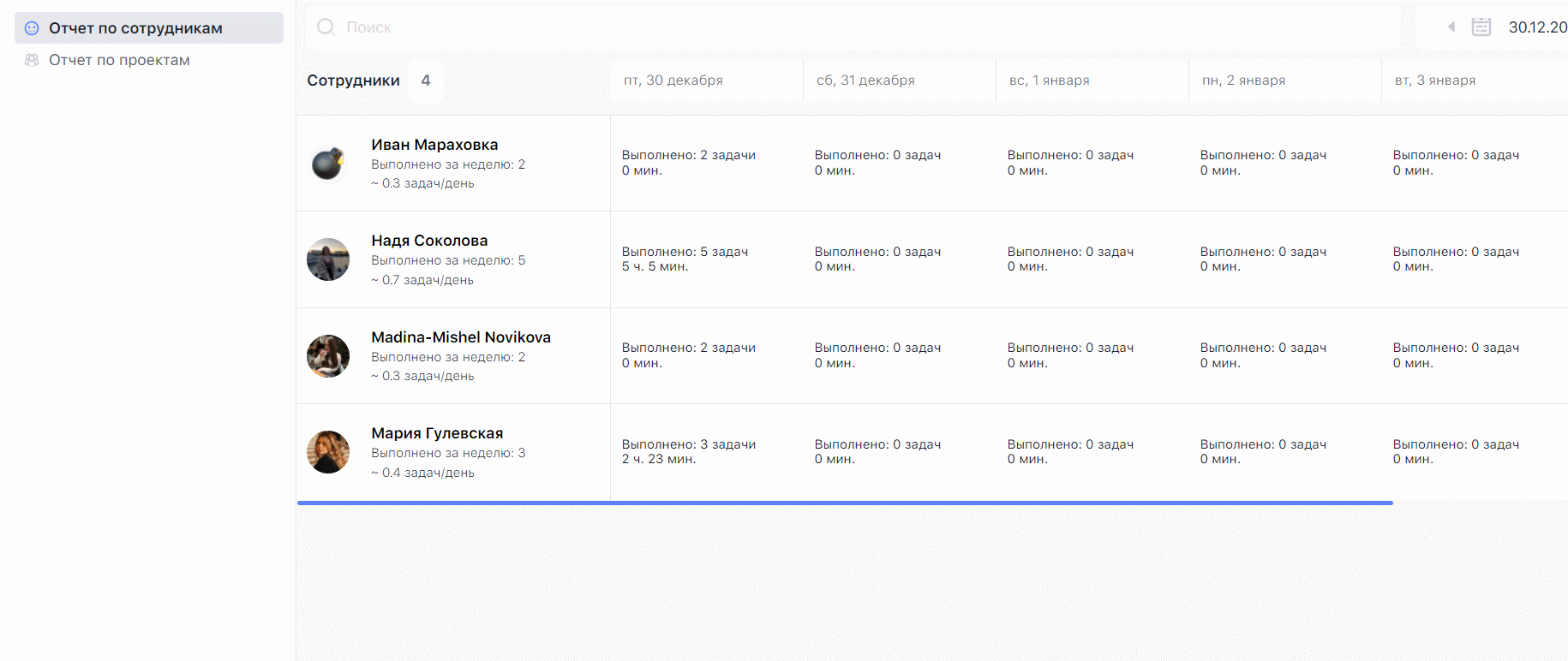 - Списки задач в Аналитике. Анализируй, какие задачи выполнял сотрудник в конкретный день с помощью списка задач. Если сотрудник запускает тайм-трекер или указывает в Загруженности затраченное время — ты увидишь это в списке задач на день.