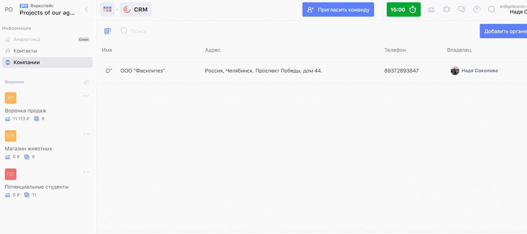 - Контакты и компании в CRM. Храни важные контакты и компании в нашей CRM — например, номера подрядчиков или адреса организаций, с которыми сотрудничаете. Прикрепляй контакты к сделкам, чтобы не забывать о важных продажах.