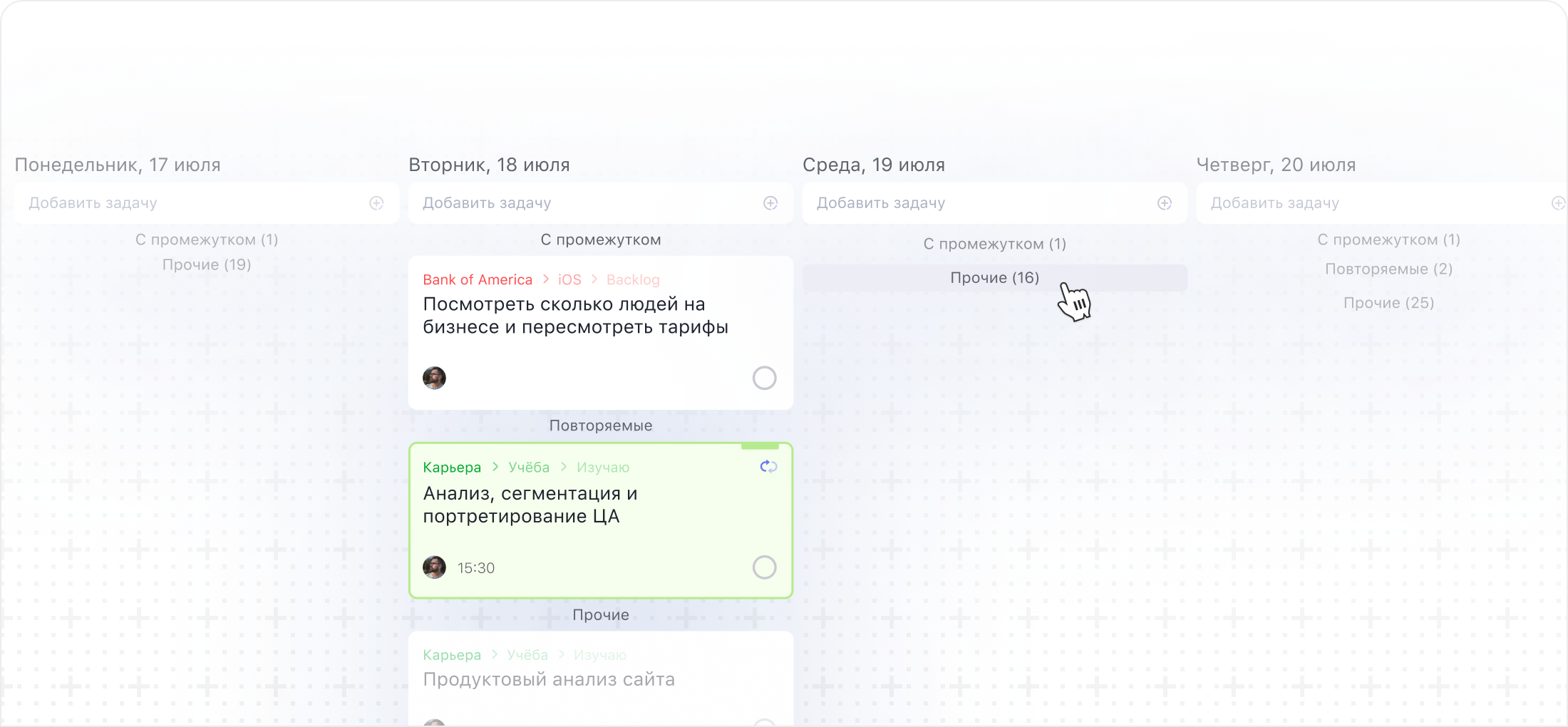 Две недели назад внутри недельного календаря добавили группировку задач по категориям «С промежутком» (длинные задачи), «Повторяемые», «Прочие». И многие пользователи отметили, что такое отображение не всегда удобно.