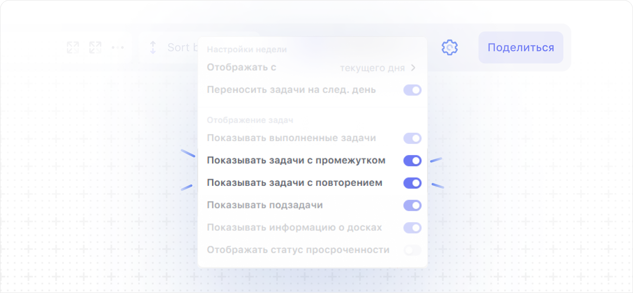 А ещё ты можешь включить или выключить отображение длинных задач и повторяемых задач в твоём календаре по клику на иконку шестерёнки с правой стороны интерфейса между выбором даты и кнопкой «Поделиться».