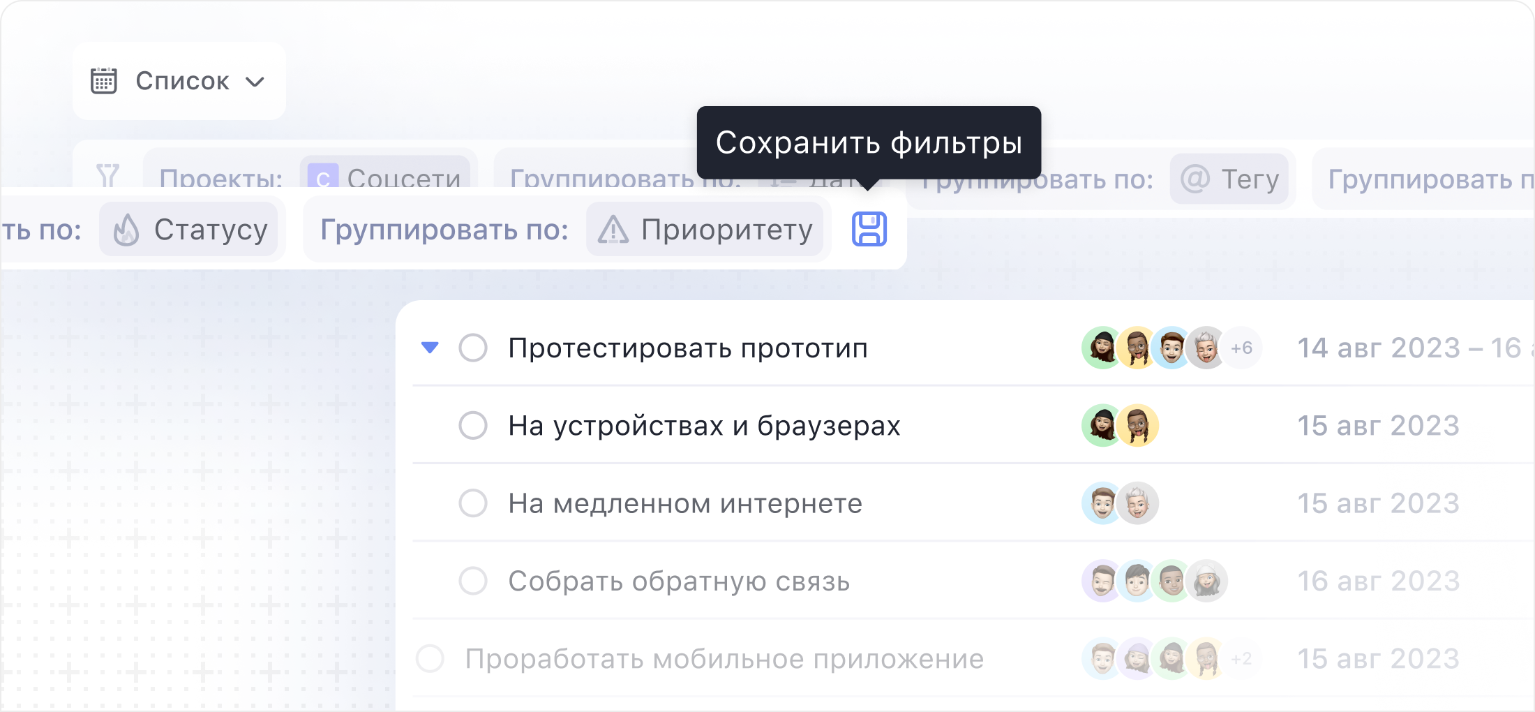 - Можно сохранить фильтр отображения колонок (при включении фильтра по дате, тегу, статусу, приоритету и т.п.)