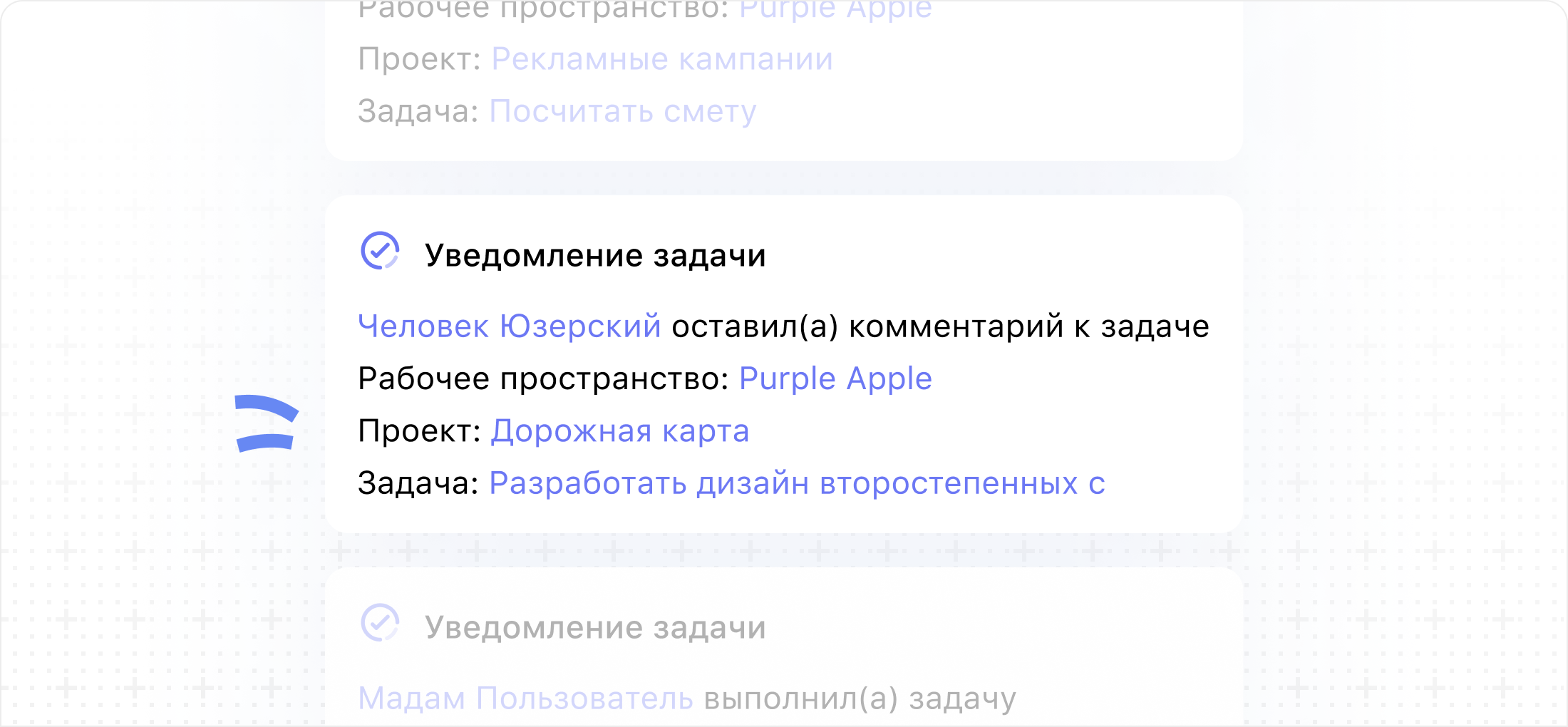 Мы поработали над информативностью уведомлений. Теперь в карточке уведомления внутри Weeek рядом с событием отображаются рабочее пространство, проект, задача — и по клику на эти данные можно сразу провалиться в нужную задачу.
