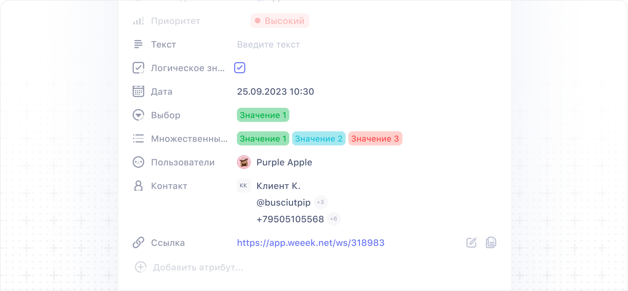 - Поле Контакт. Прикрепляй с помощью кастомного поля контакты клиентов или заказчиков, которые собираешь в CRM.