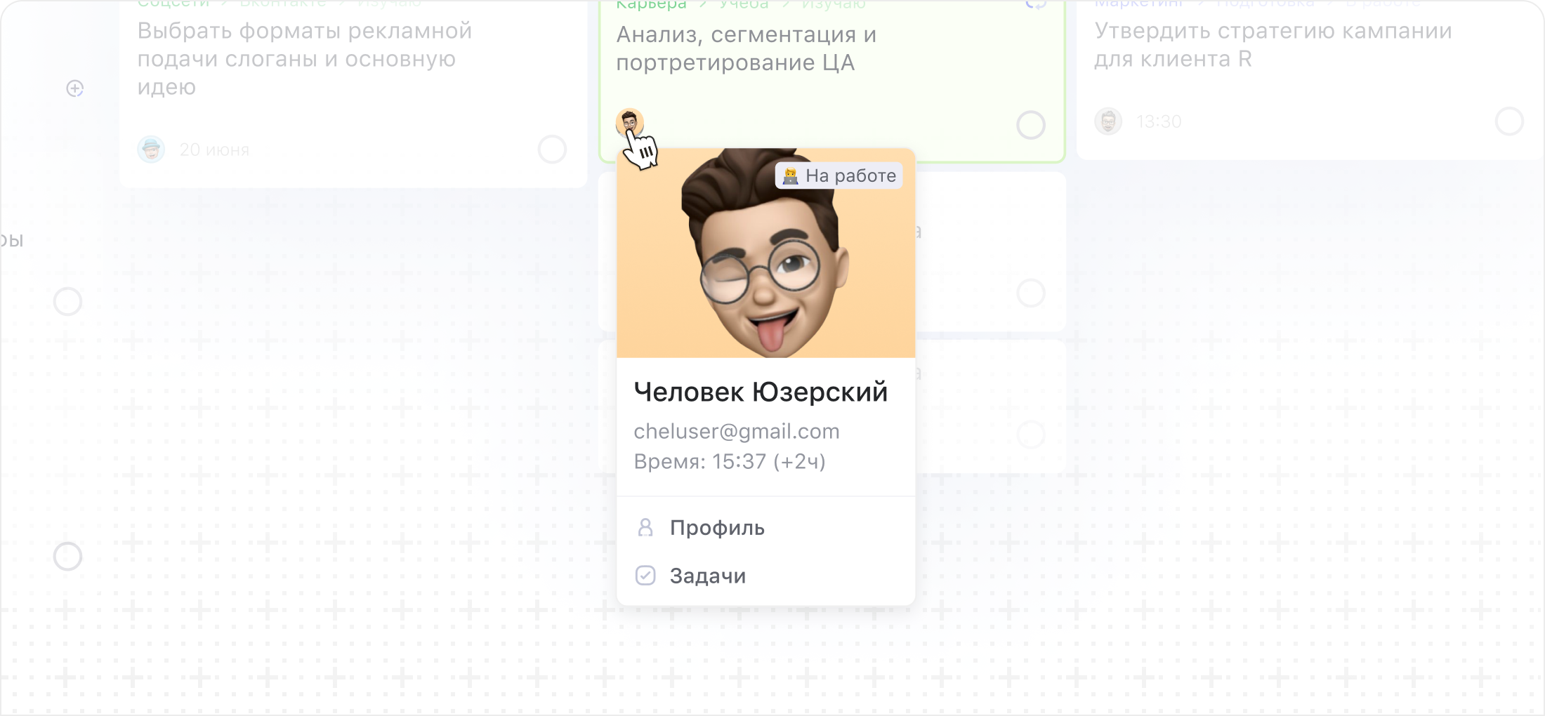 Если навести курсор на профиль пользователя, рядом откроется небольшое модульное окно. В нём более подробная информация — контакты, часовой пояс, в котором работает сотрудник, быстрый переход в профиль и к задачам пользователя. В будущем там появится ещё больше информации — текущая задача, загруженность и т. д.