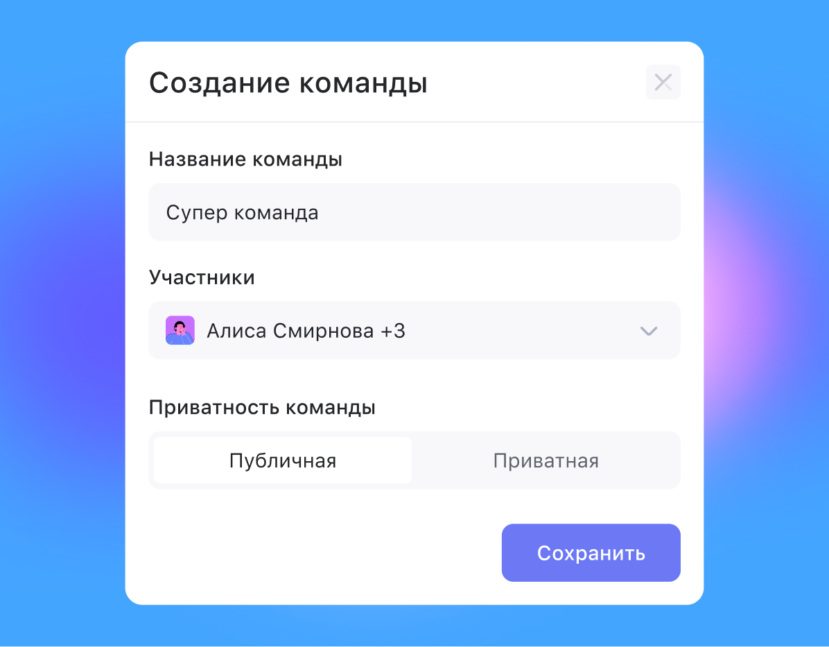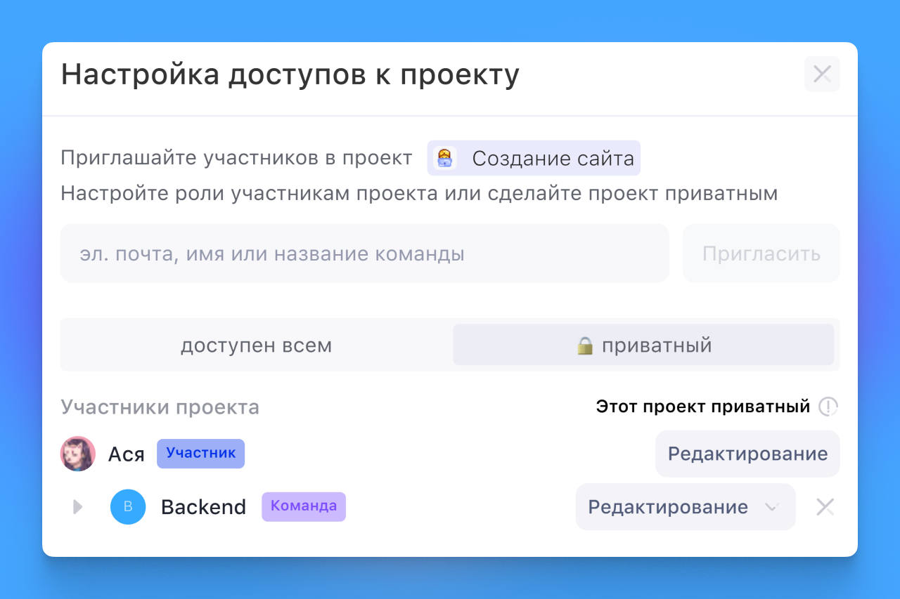 Например, при настройке приватности проекта, документа или воронки и при наличии сформированной команды ты сможешь выдать права доступа сразу группе пользователей — без точечной настройки для каждого