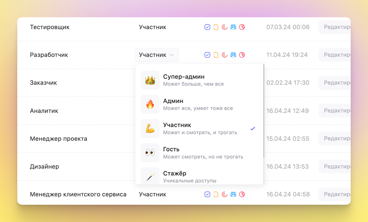 Есть три готовых роли: Участник, Админ и Супер-админ. Они отличаются доступом к настройкам пространства, управлением участниками, счетам и оплате
