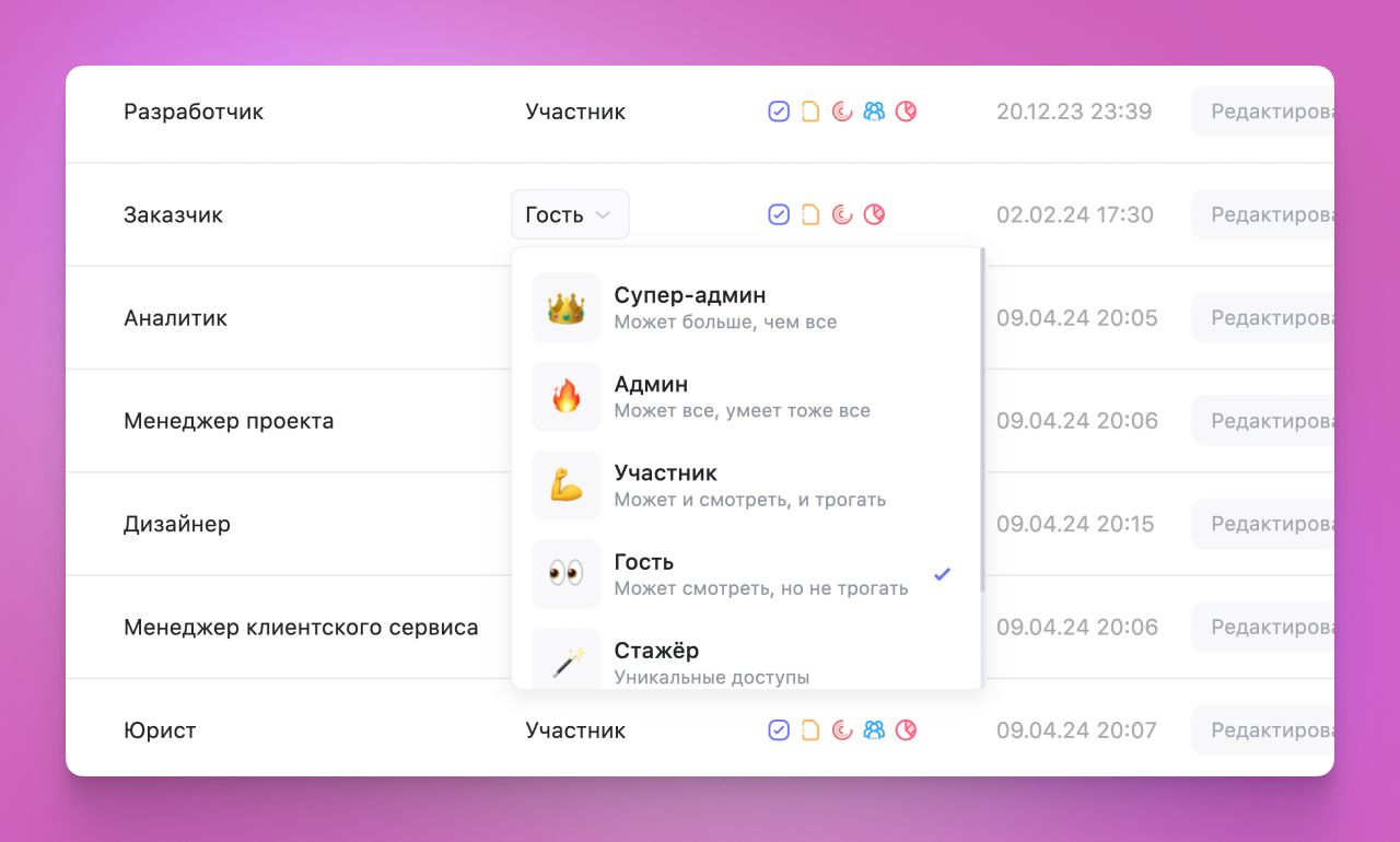 Можно создать кастомные роли с учётом специфики компании и настроить максимально индивидуальные доступы