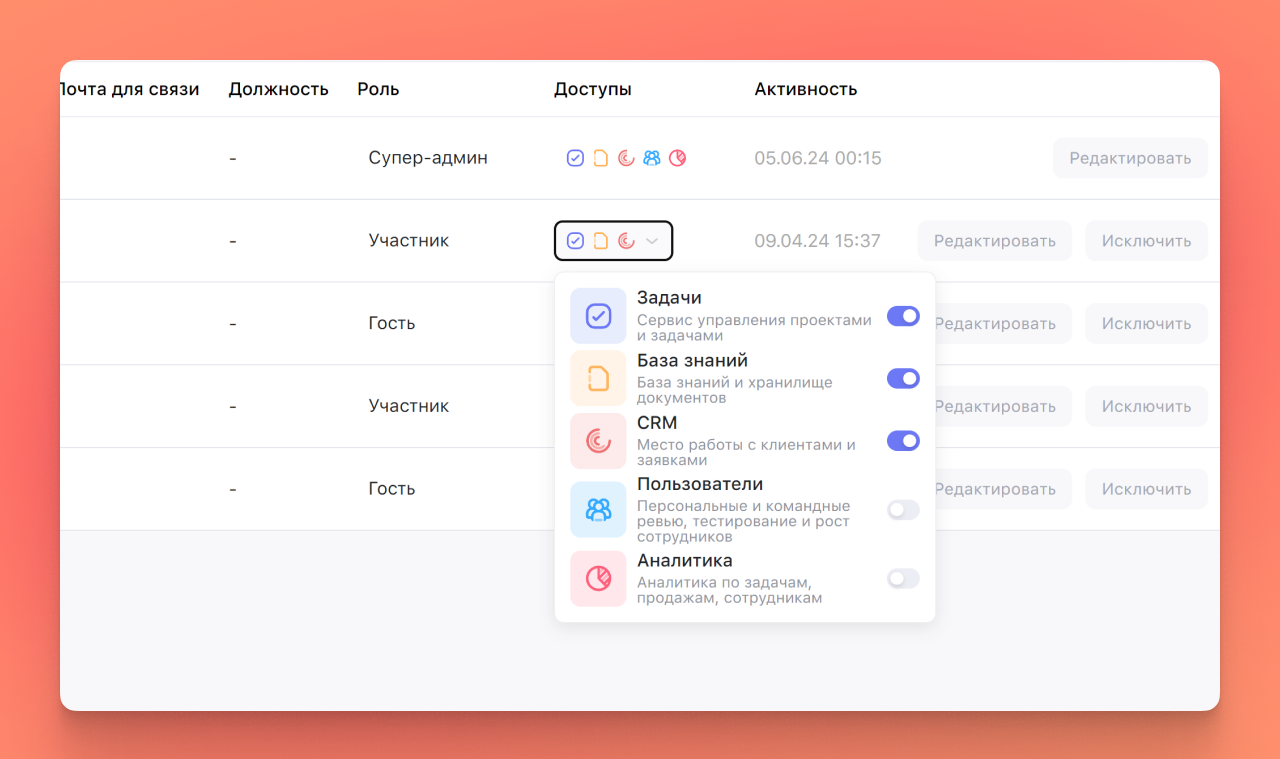 У нас пять сервисов — Задачи, База знаний, CRM, Пользователи, Аналитика. Ты можешь решить, какими сервисами может пользоваться конкретный участник рабочего пространства — например, дать доступ к Базе знаний и Задачам, но закрыть к CRM и Аналитике