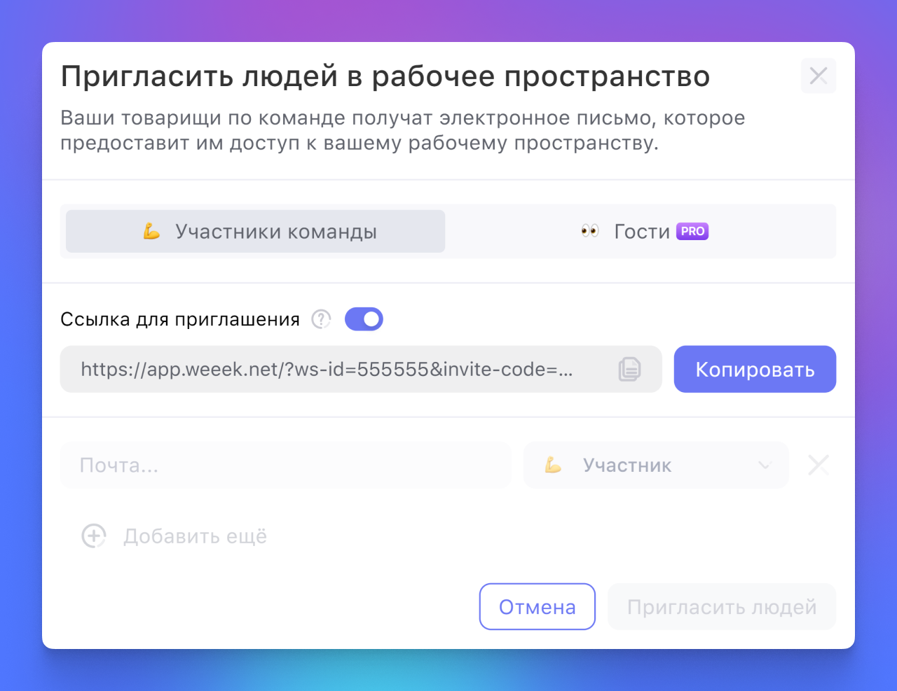 Вместо того, чтобы добавлять коллег в рабочее пространство вручную через имейл, можно пригласить их по общей ссылке