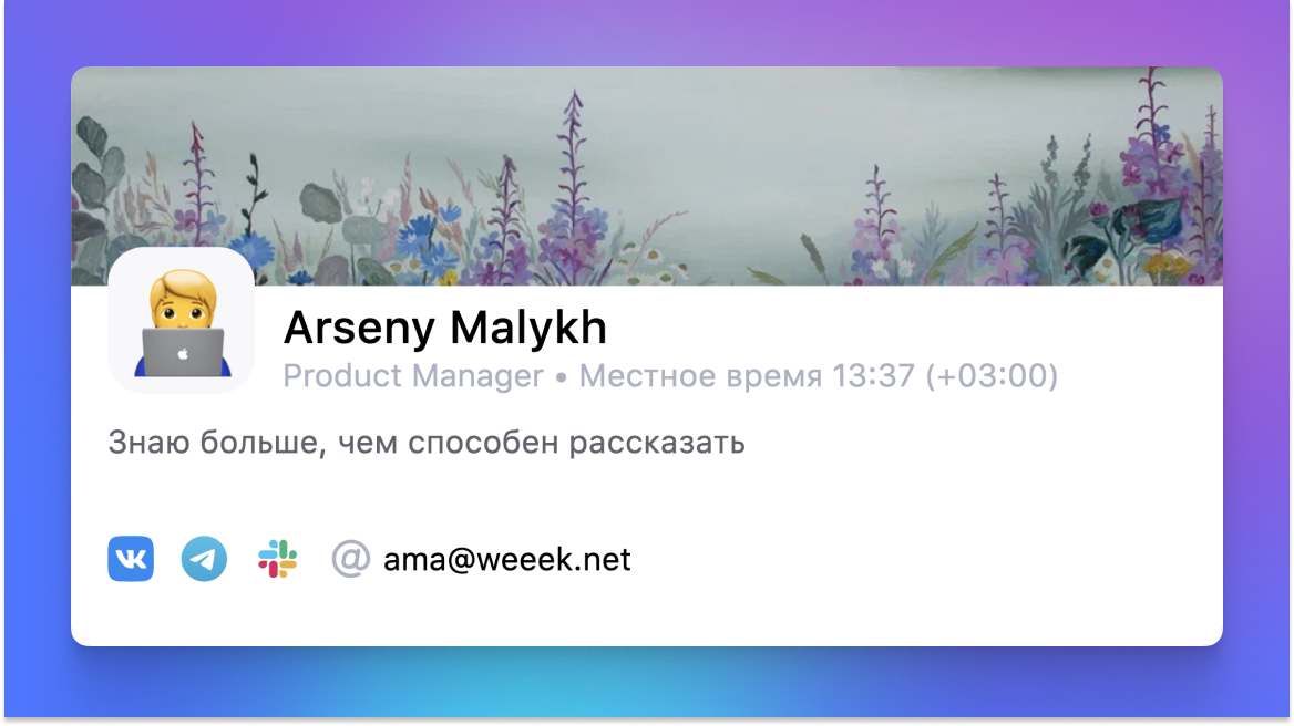 Вписать можно всё: рабочее время, способы связи, даже хобби. Если подвяжешь ссылки на свои соцсети, в них можно будет перейти в один клик прямо из Weeek