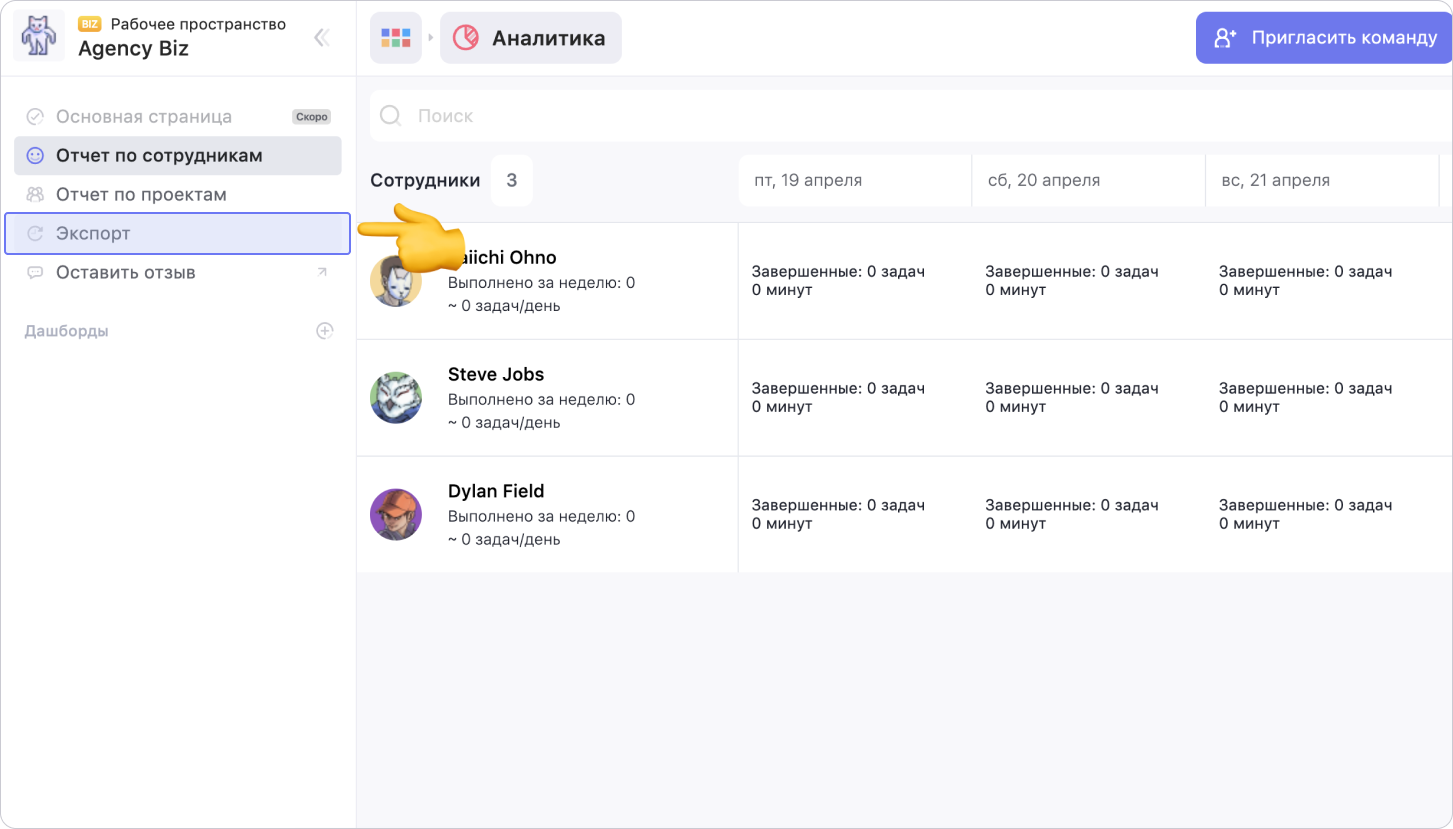 Чтобы перейти к экспорту данных рабочего пространства, перейдите в сервис Аналитика и на боковой панели выберите раздел Экспорт.